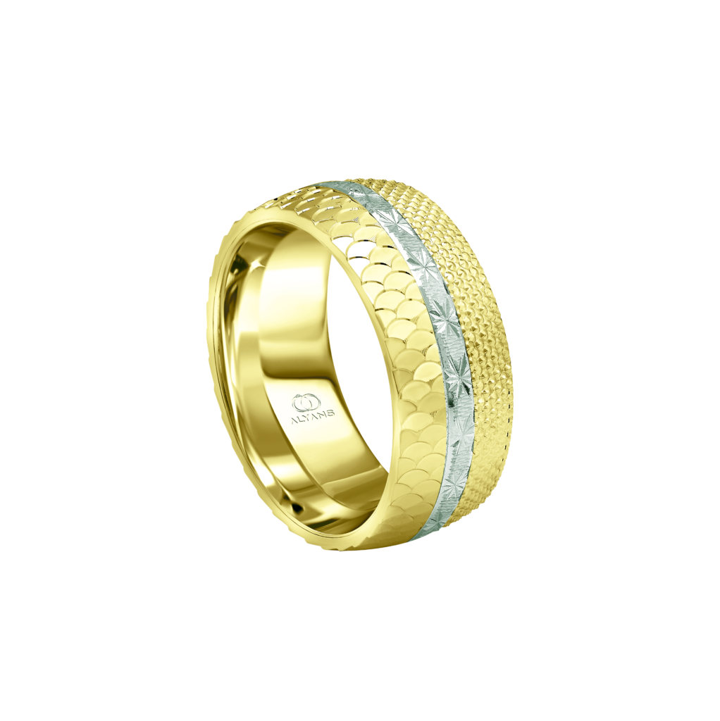 Radiate grace and elegance with this captivating gold ring adorned with intricate white gold motifs.