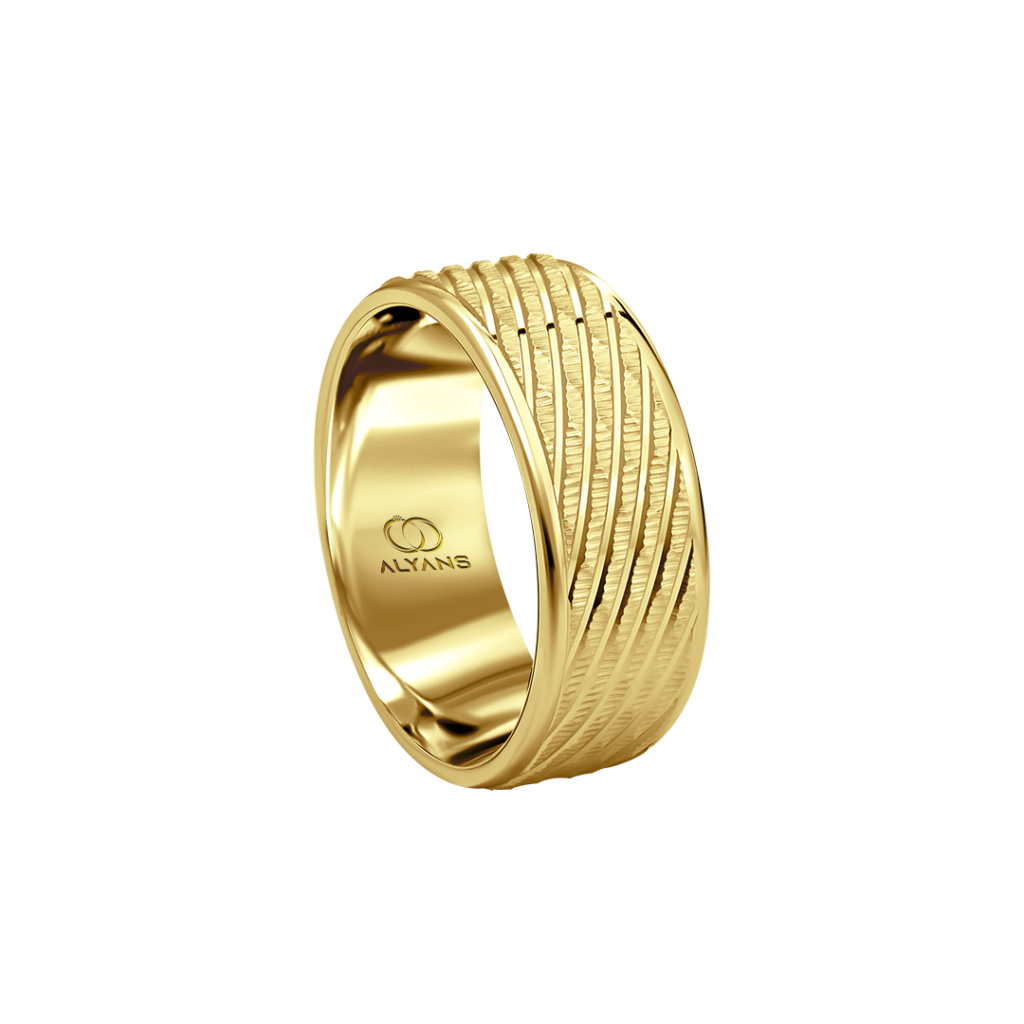 Introducing our remarkable gold wedding ring, boasting an exceptionally wide band and adorned with sleek and understated patterns, blending simplicity and boldness to create a captivating symbol of love and commitment.