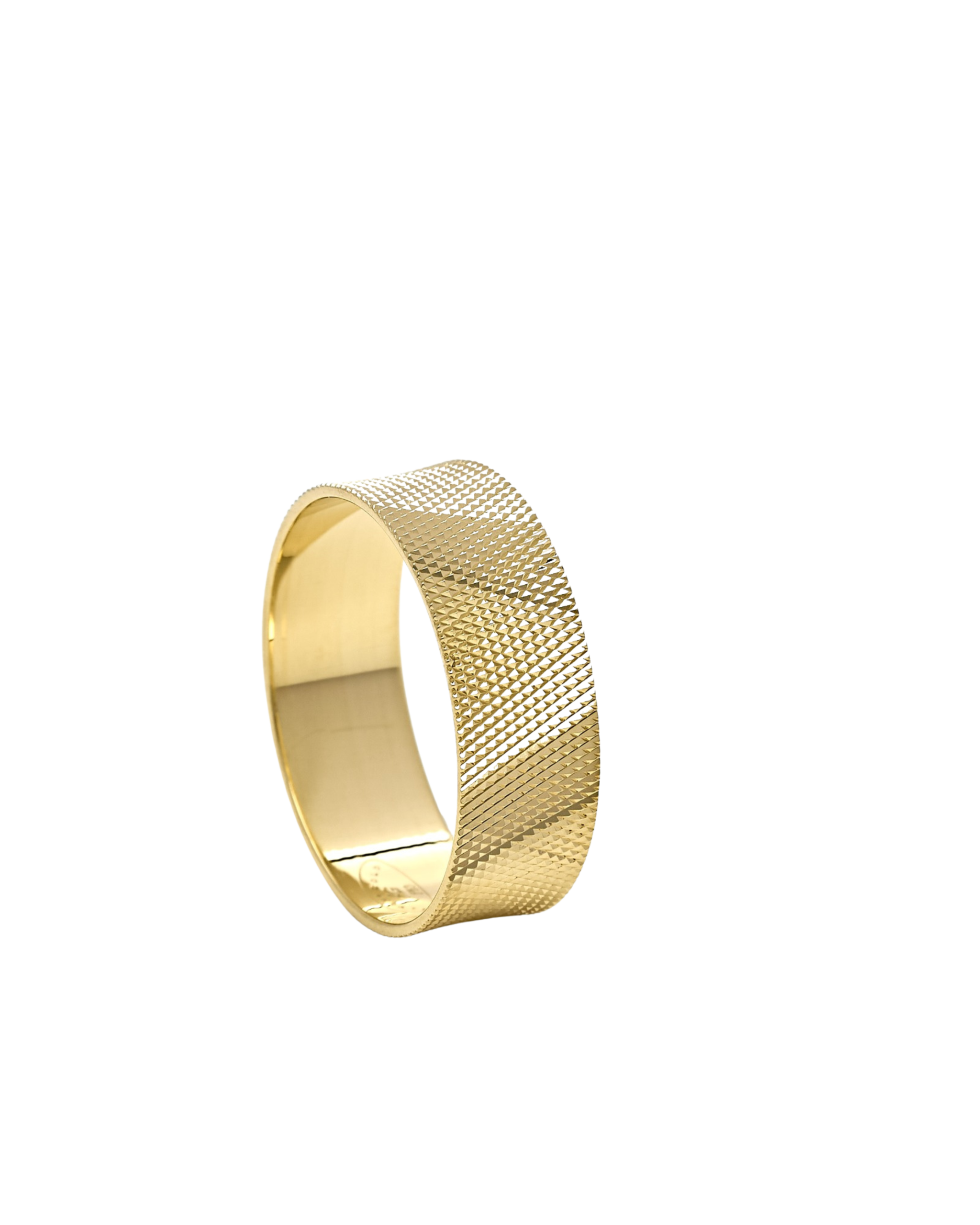 Introducing our extraordinary gold wedding ring, featuring a wider band and an exquisite pattern of gracefully sloping lines, embodying a captivating blend of modernity and timeless elegance.