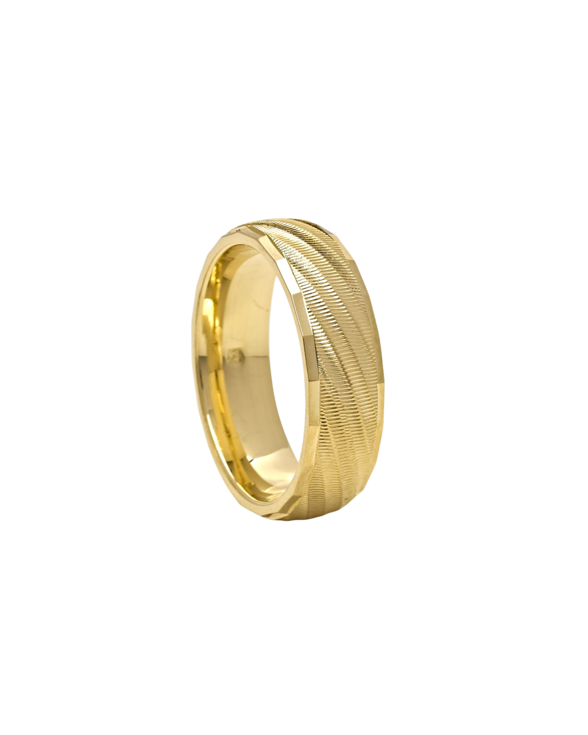 Introducing our captivating gold wedding ring, boasting a wide band adorned with a mesmerizing pattern of delicate, tiny circles, adding a touch of sophistication and grace to this timeless symbol of love and commitment.